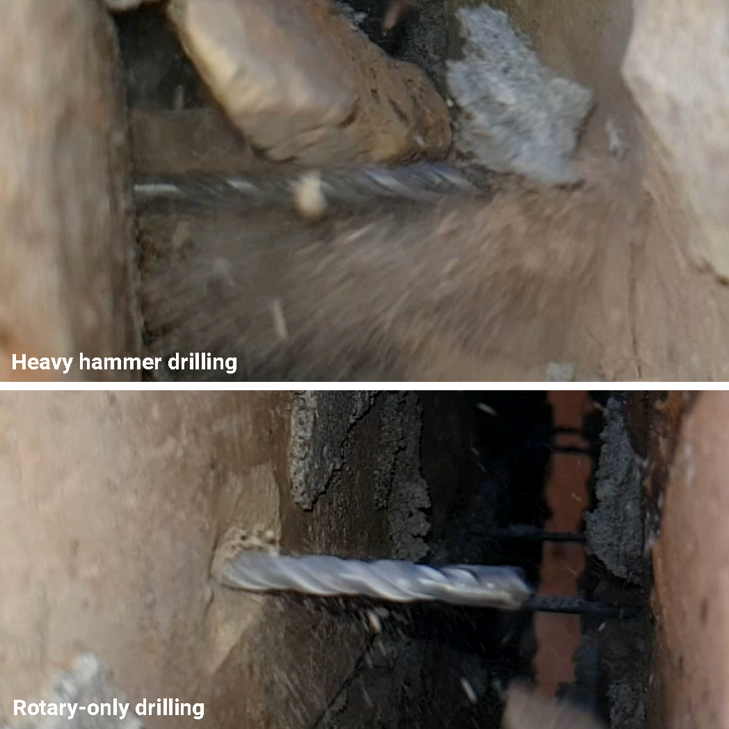 Drill bit selection and drilling method significantly affect anchor performance in masonry (brick masonry, concrete block, stone masonry). Rotary-only drilling minimizes substrate damage—reducing blowout and micro-cracking—and results in higher anchor capacity.